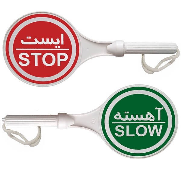 ایست دستی به شکل راکت طراحی شده و یک صفحه دایرهای روی دسته آن قرار دارد. یک طرف صفحه کلمه «آهسته | SLOW» قرار گرفته که برای کاهش سرعت استفاده میشود و طرف دیگر کلمه «ایست | STOP» درج شده تا دستور توقف کامل صادر شود. نوشتهها با شبرنگ باکیفیت و به دو زبان فارسی و انگلیسی تولید میشوند تا راننده حتی در شب، مه، باران یا شرایط کمدید نیز قادر به تشخیص پیام باشد. این خوانایی بخش مهمی از عملکرد تابلو ایست دستی است زیرا هشدار باید سریع و بدون خطا دیده شود.